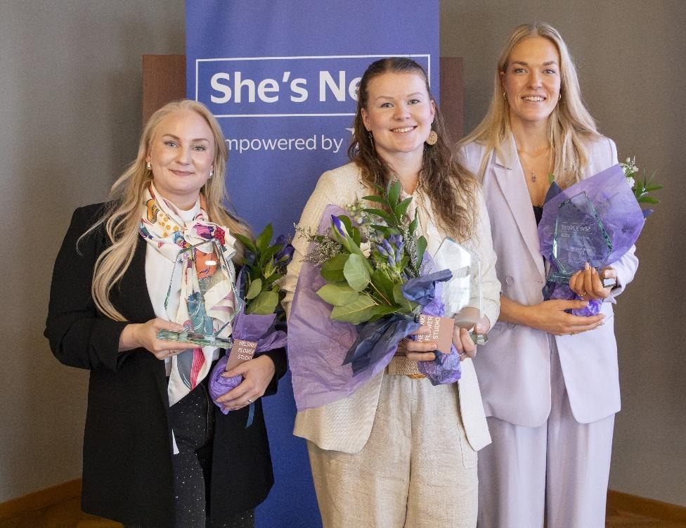 Kuvassa Visan She’s Next -ohjelmaan valitut yritykset vuonna 2024. Vasemmalta oikealle Tytti Tamminen (Moneybee), Anniina Kopperoinen (Lovepaws) ja Laura Ahti (Equestrain).