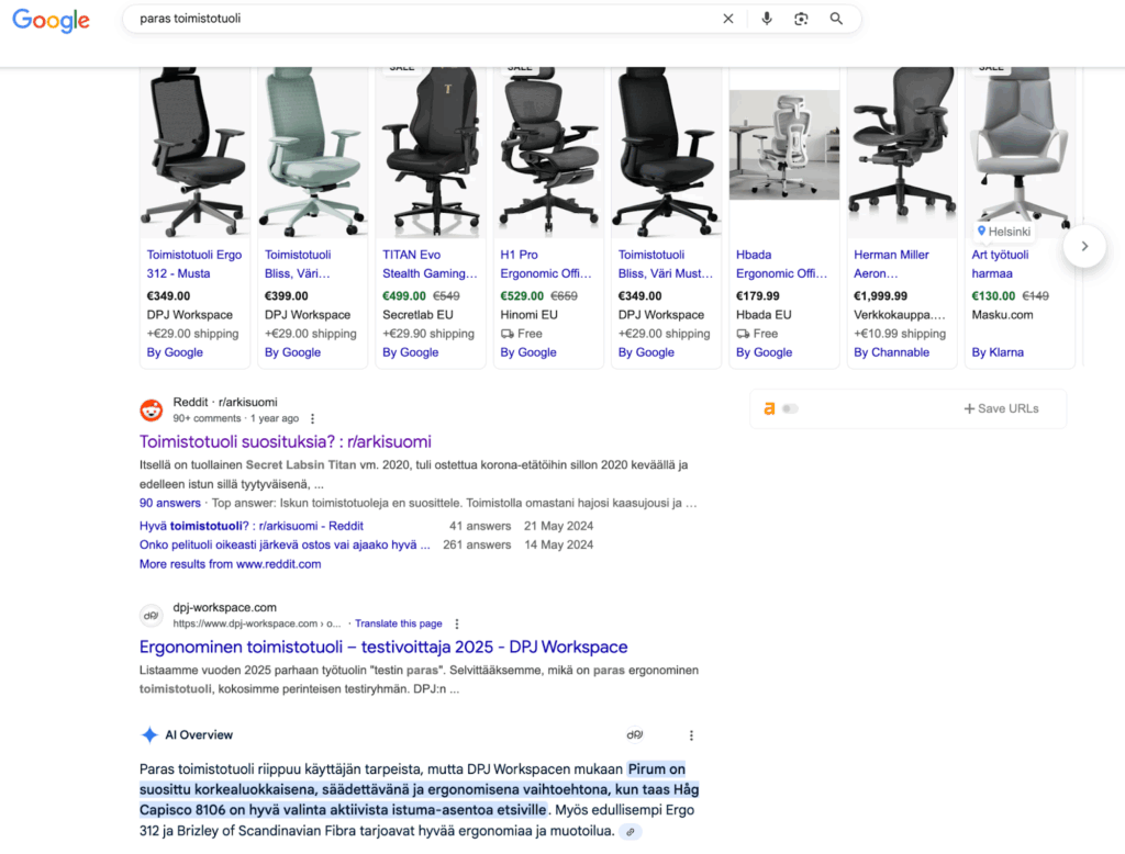 Jokaisen verkkokaupan elinehto on ollut hyvä löydettävyys hakukoneissa (SEO) ilman maksettua mainontaa. Yritykset ovat hakukoneoptimoineet sisältöjä hakukoneille ja käyttäjille löydettäväksi jo +15 vuoden ajan. Tekoälyn tuomat mahdollisuudet sisältöjen löydettävyydelle tuovat uusia ulottuvuuksia, joita jokaisen verkkokaupan on huomioitava juuri tässä hetkessä. Esimerkiksi Googlen AI-yhteenveto hakutuloksissa on jo pysyvästi muuttanut sitä, miltä hakutulossivu Googlessa näyttää, sekä miten yritysten linkit Googlessa näkyvät ja millä paikalla sivua. Puhutaan zero-click efektistä, jossa käyttäjä saa tarvitsemansa tiedon joko suoraan hakutulossivulta tai tekoälytyökalussa (ChatGPT, Gemini, Claude, jne.).